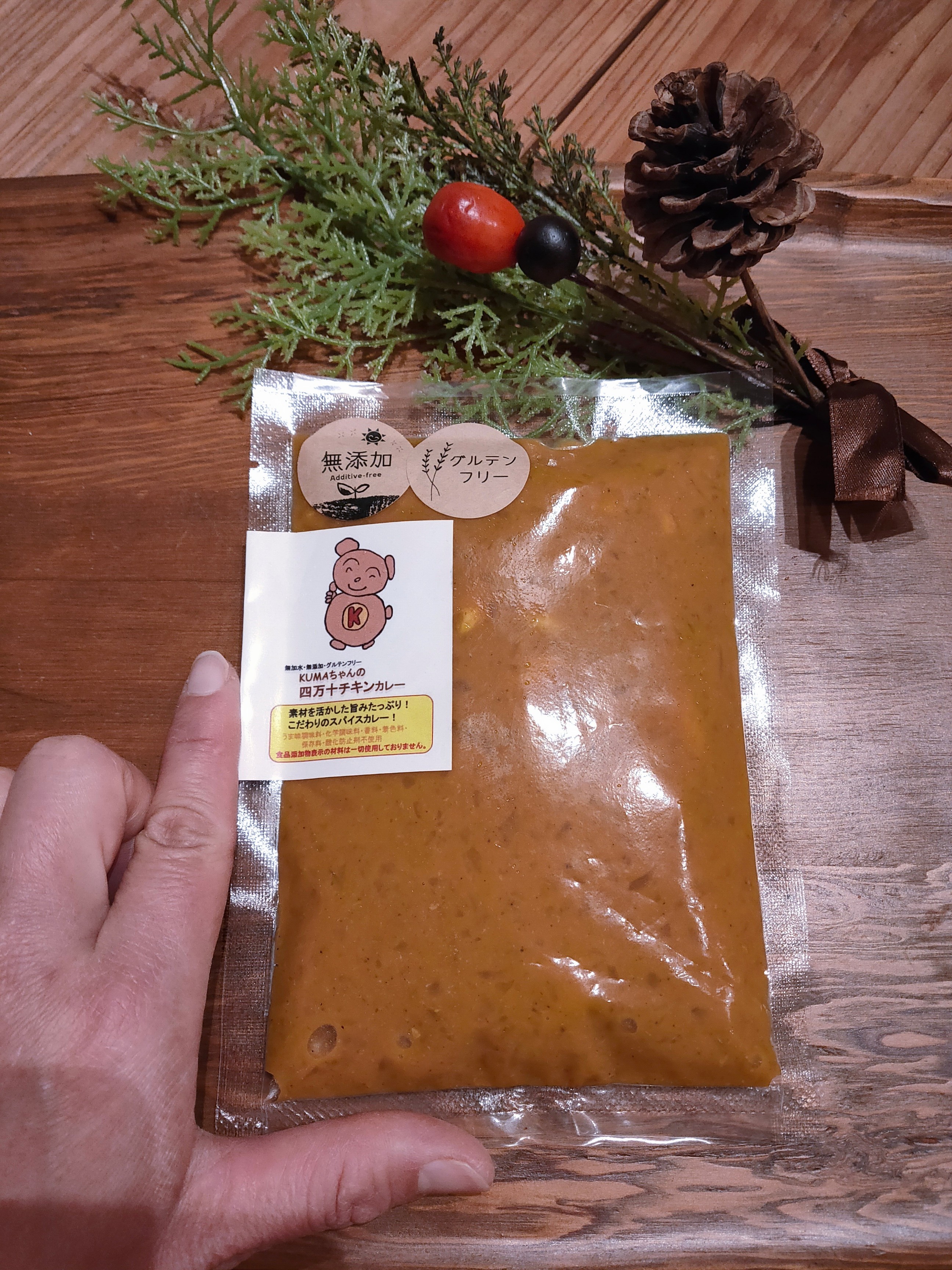 トマトジュース(国内製造)、四万十鶏(高知県産)、玉ねぎ、チャツネ、天日塩(高知県黒潮町産)、香辛料、(一部に乳成分・鶏肉・バナナを含む)