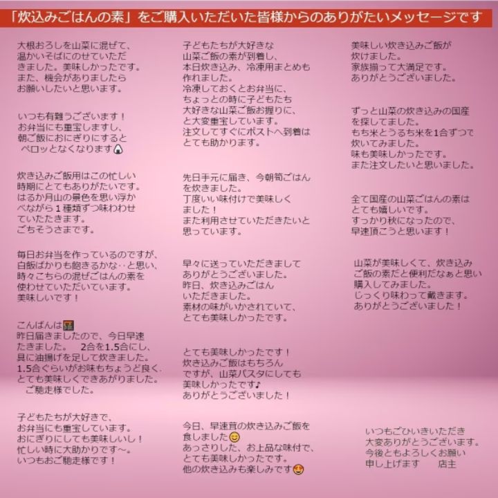 わらび・なめこ・こんにゃく・人参入りです。 お米を2合研ぎ本品を液、具材共に入れて水を加えて炊いてください。 炊きあがったら軽く混ぜ合わせてお召し上がりください。