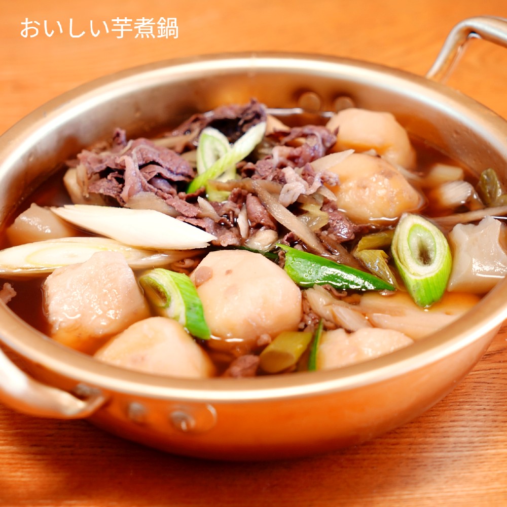 食材は里芋・牛肉・豆腐・こんにゃく・きのこ・ねぎ等を大鍋で醤油味で炊込みます。