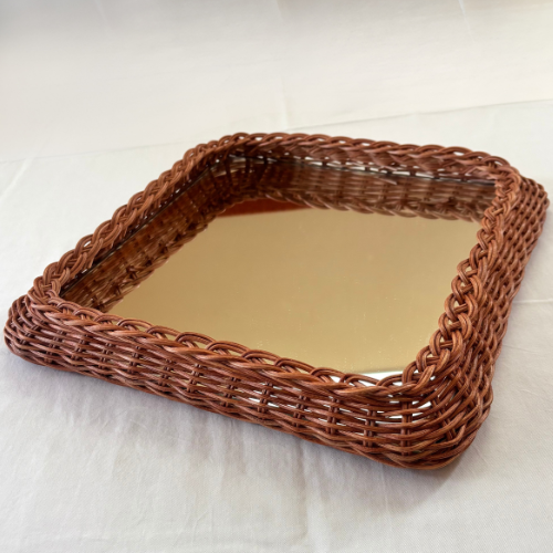 ラタンを丁寧に編み上げた、柿渋染めのスクエアミラーです。