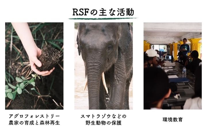 RSFは野生動物と人の共生を目指す団体です。野生ゾウの保護、植林、環境教育のほか、パーム油の農家からアグロフォレストリー農家に転向できるプログラムを農家に提供する活動をしています。