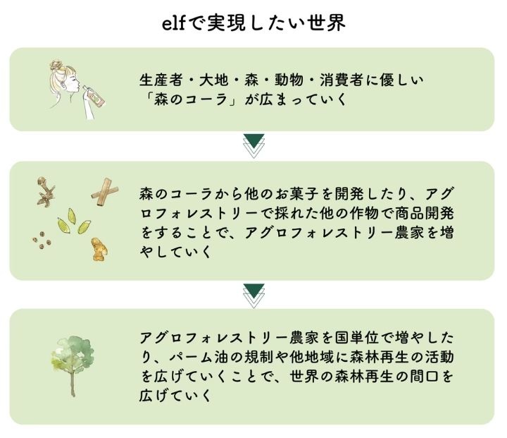 elfは、RSFを介してアグロフォレストリーで採れたスパイスを日本に輸入し、森のコーラの製造・販売を行います。