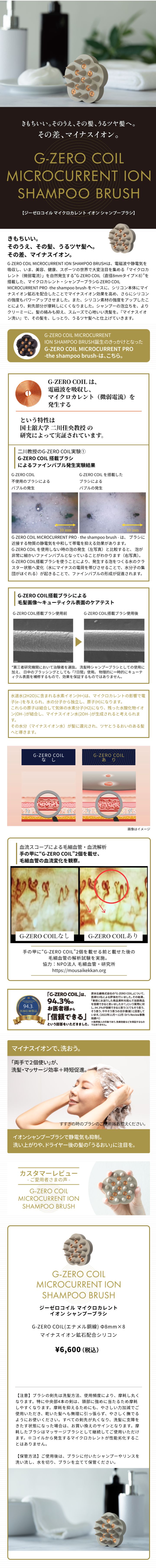 G-ZERO COIL MICROCURRENT ION SHAMPOO BRUSHは、電磁波や静電気を吸収し、いま、美容、健康、スポーツの世界で大変注目を集める「マイクロカレント(微弱電流)」を自然発生する“G-ZERO COIL(直径8mmタイプ×8)”を搭載した、マイクロカレント・シャンプーブラシG-ZERO COIL MICROCURRENT PRO -the shampoo brush-をベースに、シリコン本体にマイナスイオン鉱石を配合したことでマイナスイオン効果を高め、さらにシリコンの強度もパワーアップさせました。また、シリコン素材の強度をアップしたことにより、剣先部分が摩耗しにくくなりました。シャンプーの泡立ちを、よりクリーミーに。髪の絡みも抑え、スムーズで心地いい洗髪を。『マイナスイオン洗い』で、その髪を、しっとり、うるツヤ髪へと仕上げていきます。
