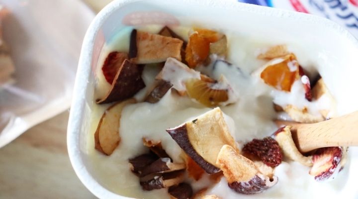 夜作って、朝出来上がったのがこちら。ヨーグルトの水分をドライフルーツが吸い込んで、生のフルーツのような食感に戻っています!これが美味しい♪
