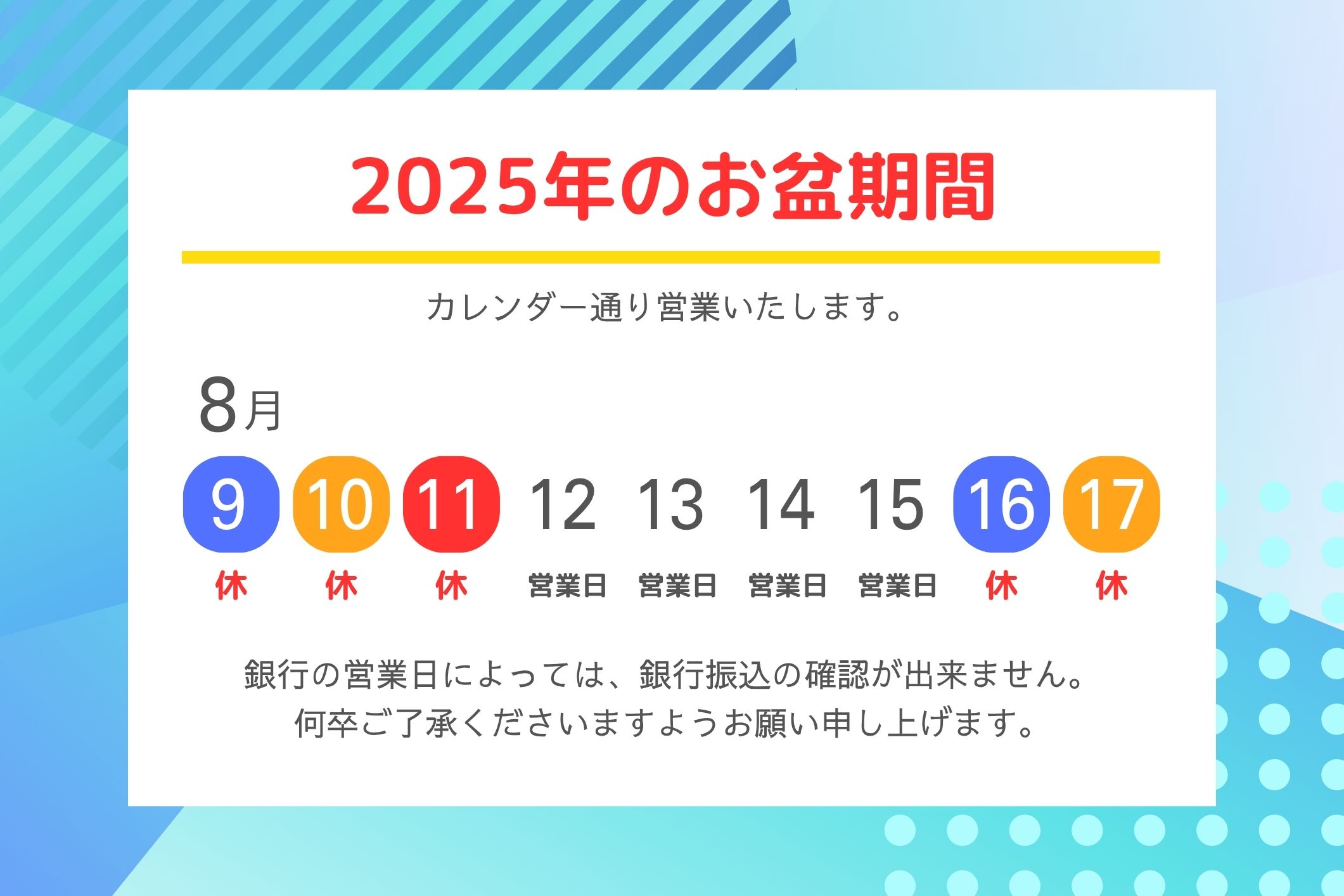 2025年のお盆期間中はカレンダー通り営業いたします。