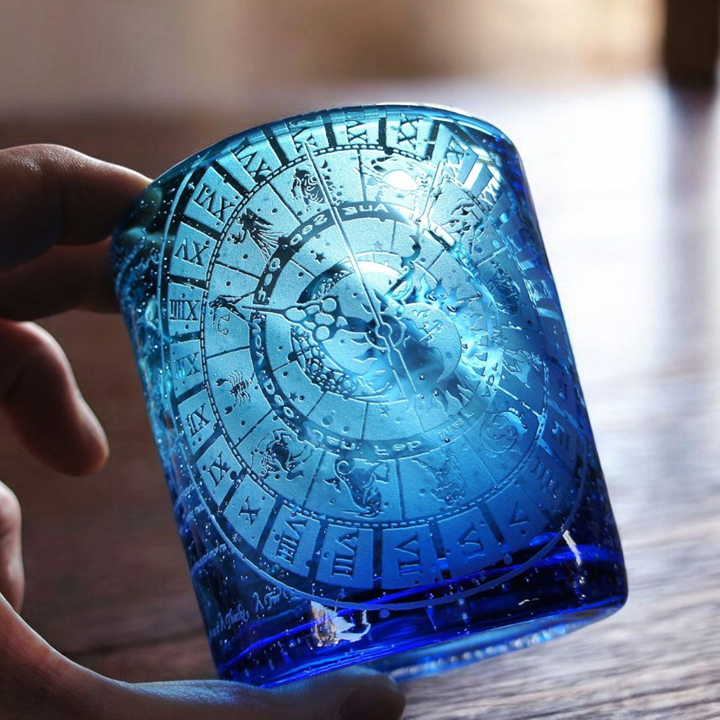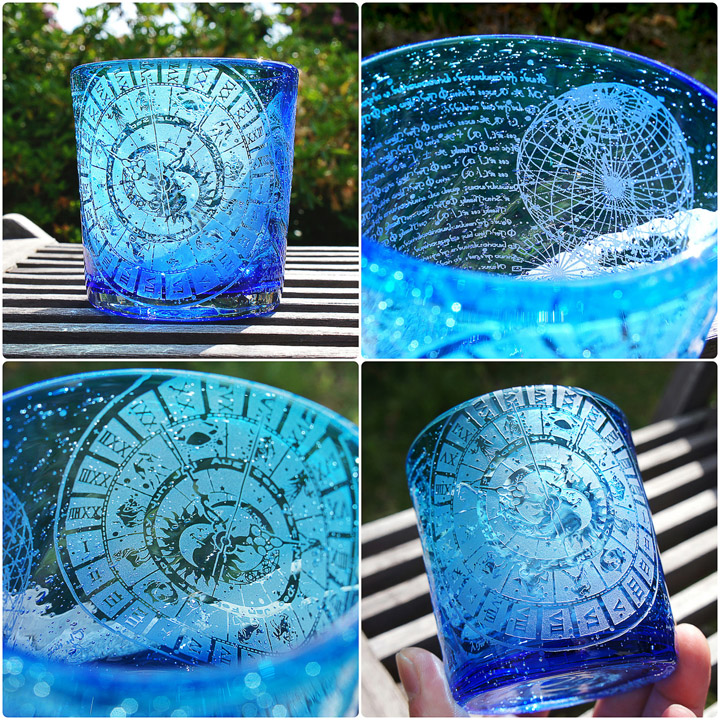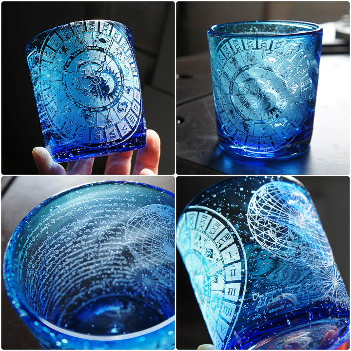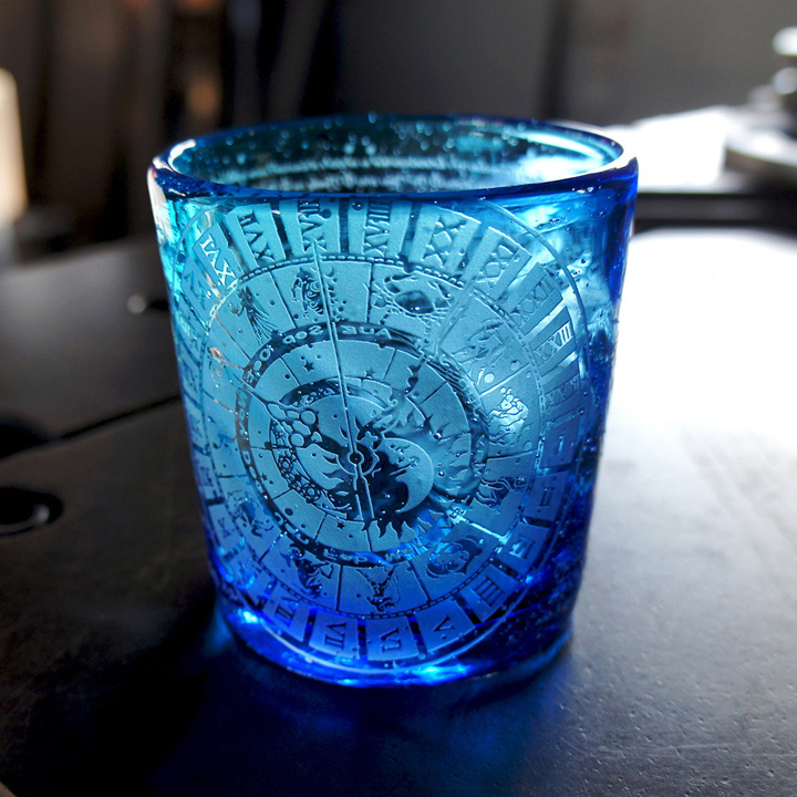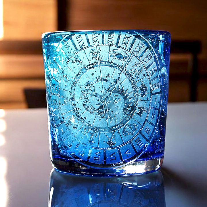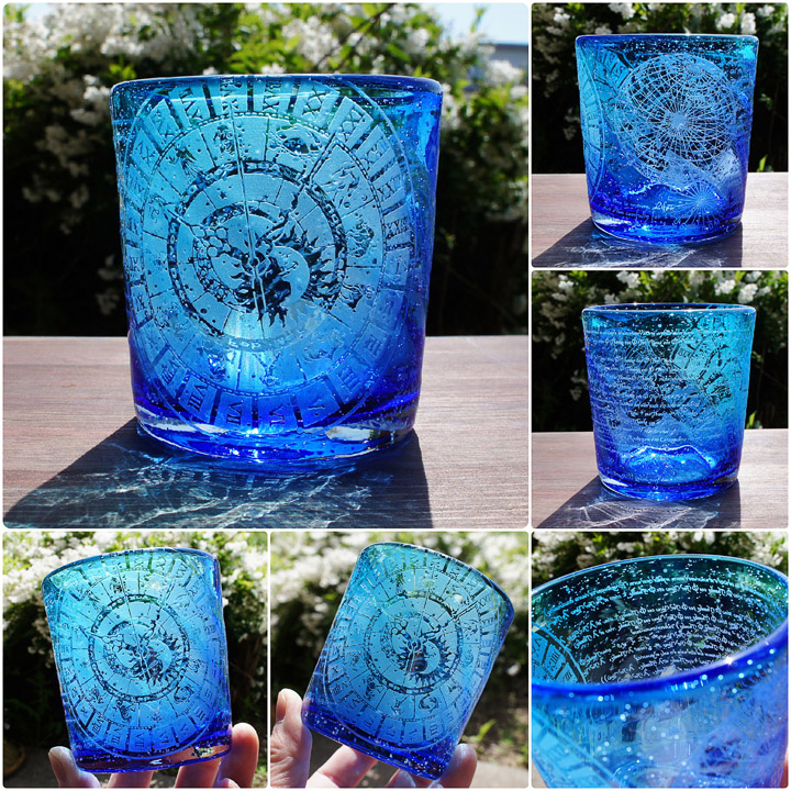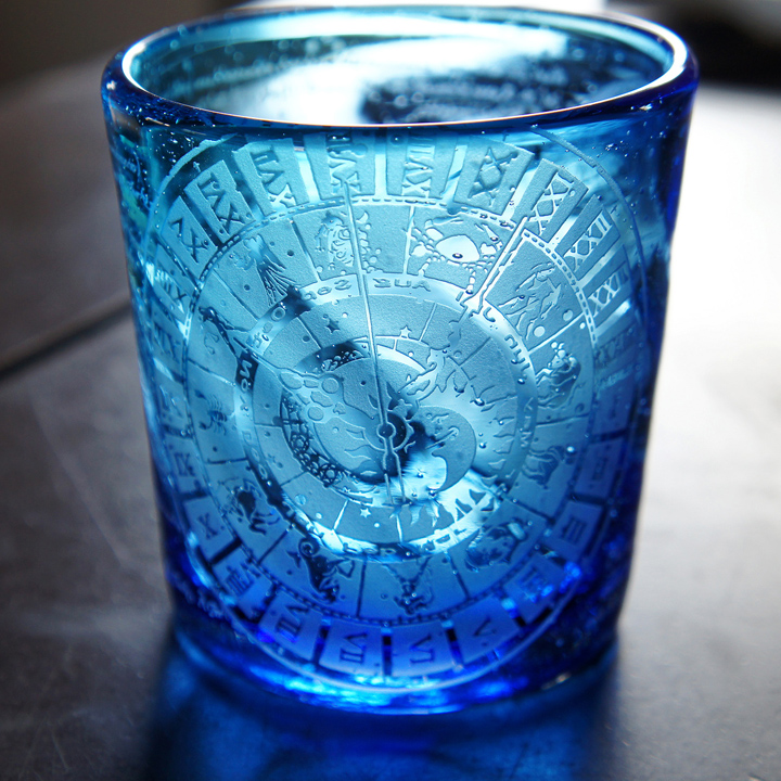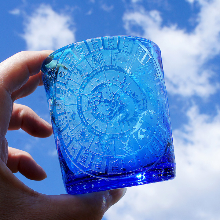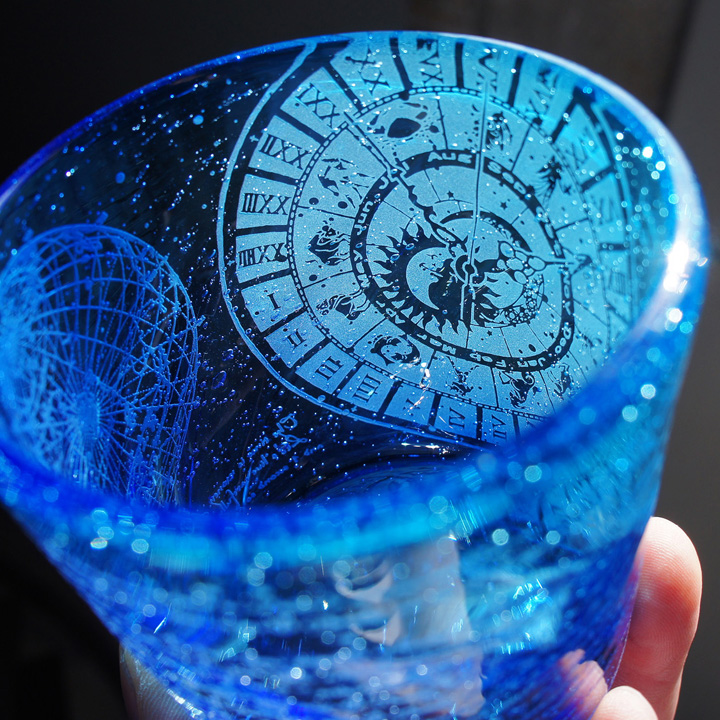 独特な絞り琉球グラス(オールド)に時間(χρόνος:クロノス)にまつわるものを彫刻してます。