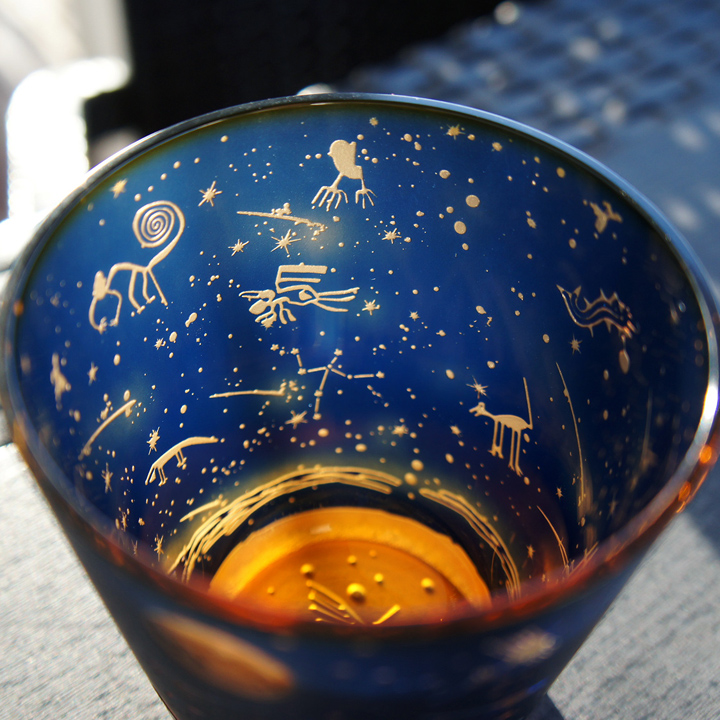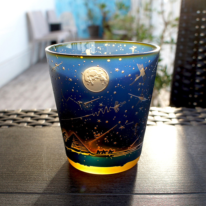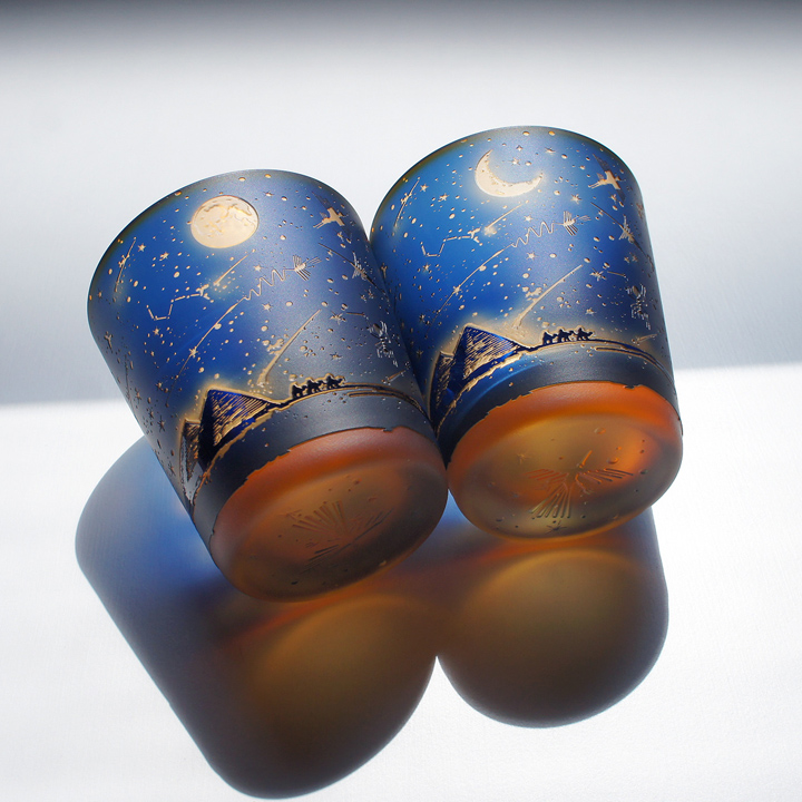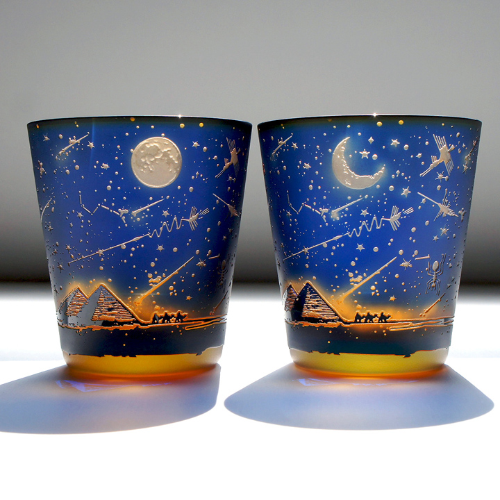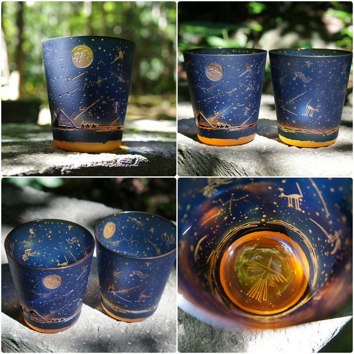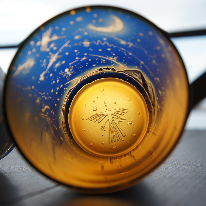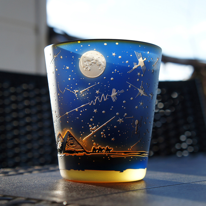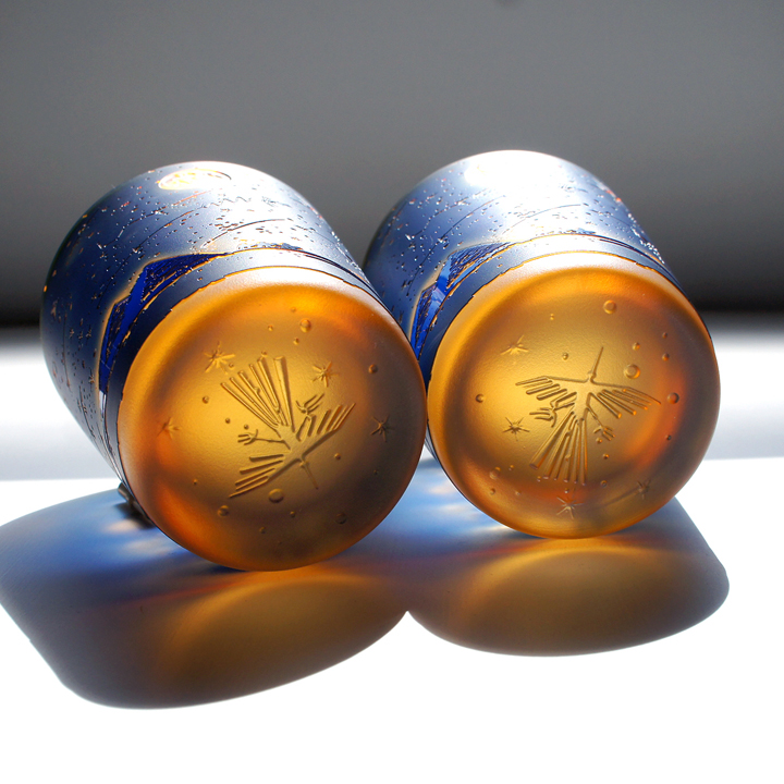 紺色被せ、下地オレンジのオールドグラスにナスカ砂漠の旅人をテーマにサンドブラスト技法にて彫刻した作品。