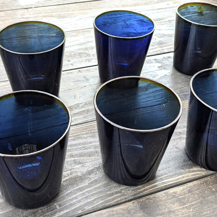 個体差で変わりますが光の入り具合で澄んだ青色や、暗いイメージに見える楽しいグラスです。