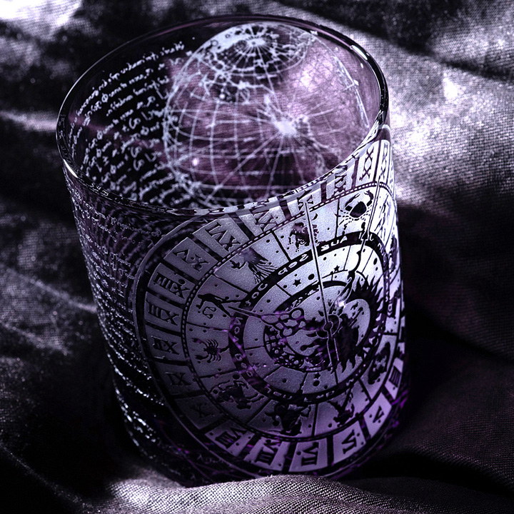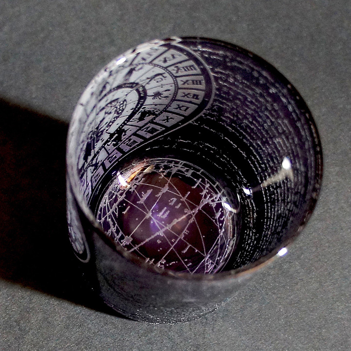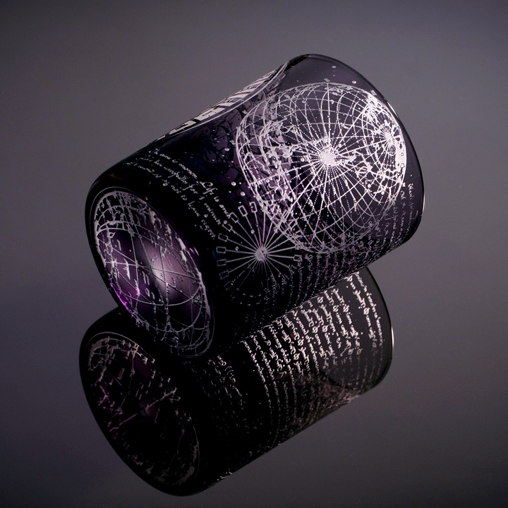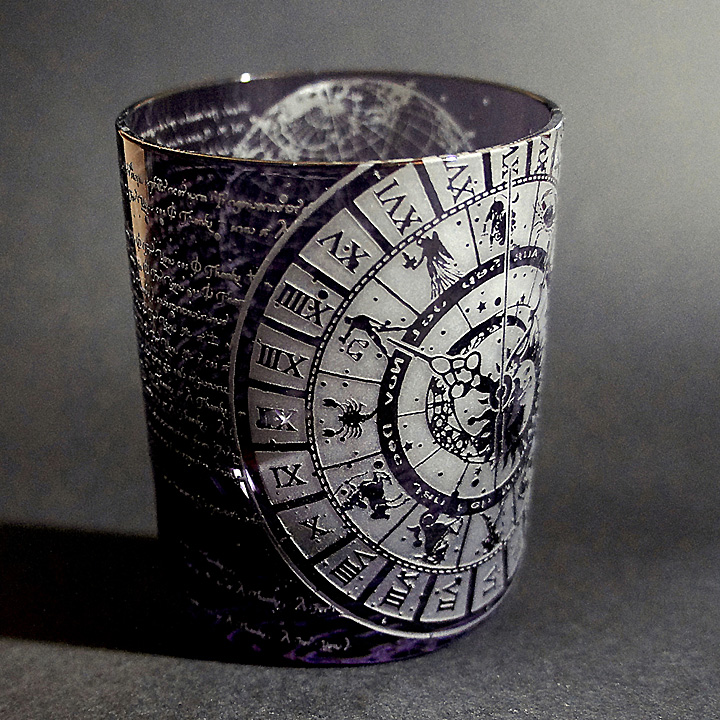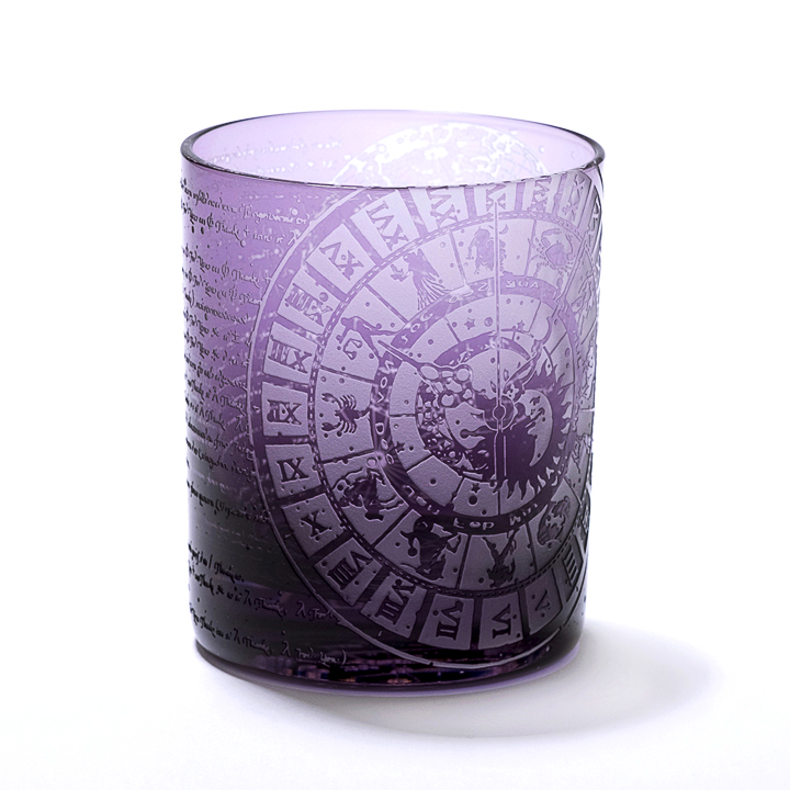パープル色(二藍)被せのオールドグラスに時間(χρόνος:クロノス)にまつわるものを彫刻してます。