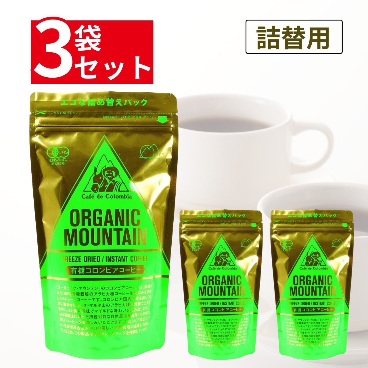 オーガニックマウンテン カフェインレス有機インスタントコーヒー80g × 3袋 詰替【コロンビア産アラビカ種100%・有機JAS認証】